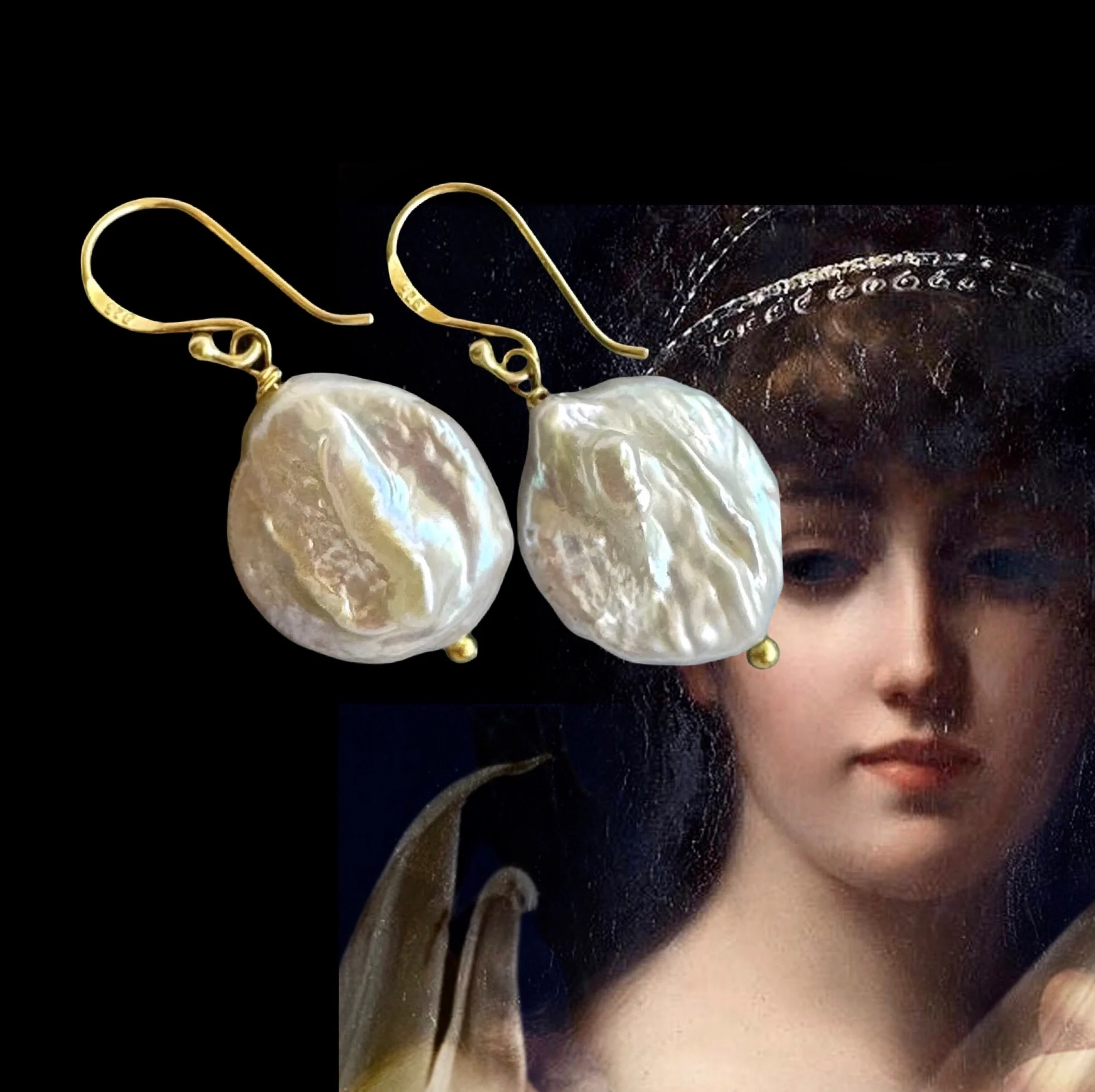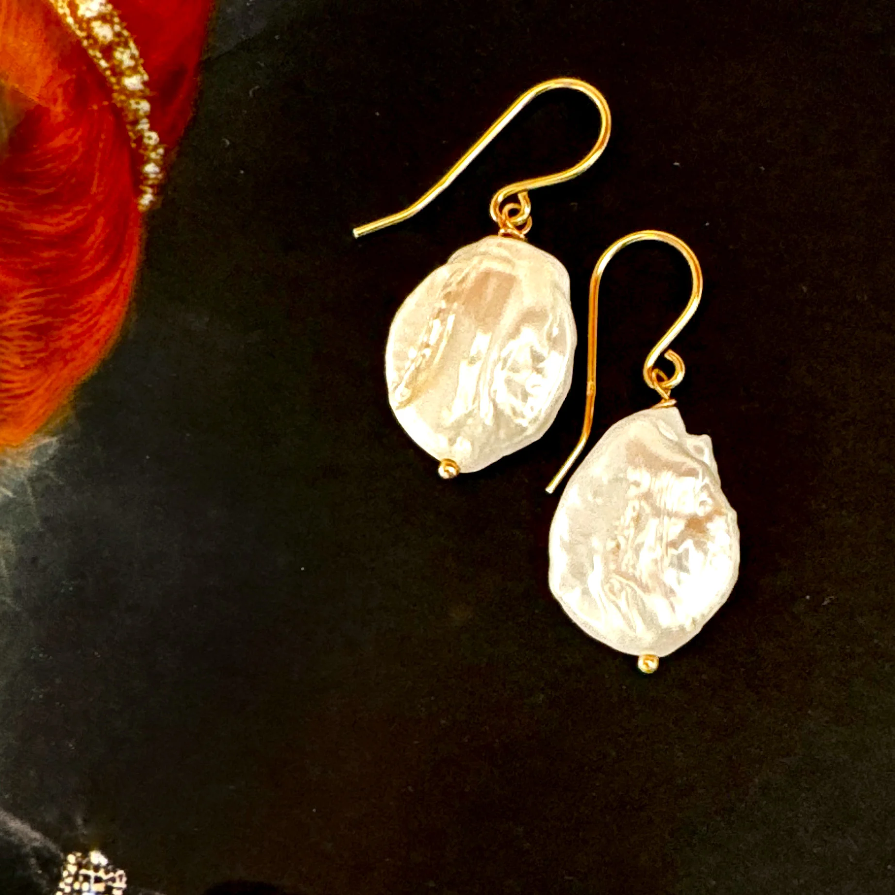 Stunning large Keshi pearls on simple sterling 14k rolled gold hooks.The Keshi pearls measure 2x1.5cm and drop of the earring from the ear lo be is 3.6cm.