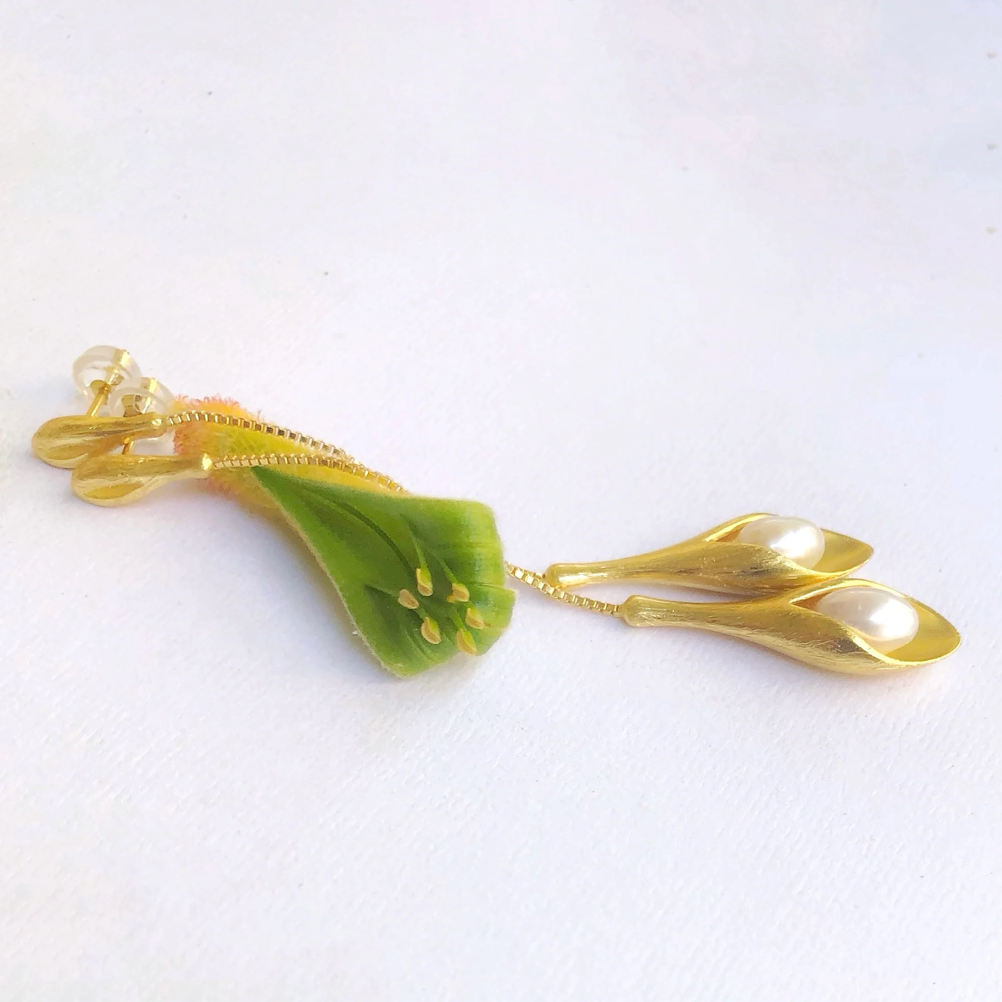 Delicate and yet making a statement flower drop earrings are easy, light and comfortable to wear. A sweet white freshwater pearl enhances each of the flower centers. These earrings drop 6cm from the stud.