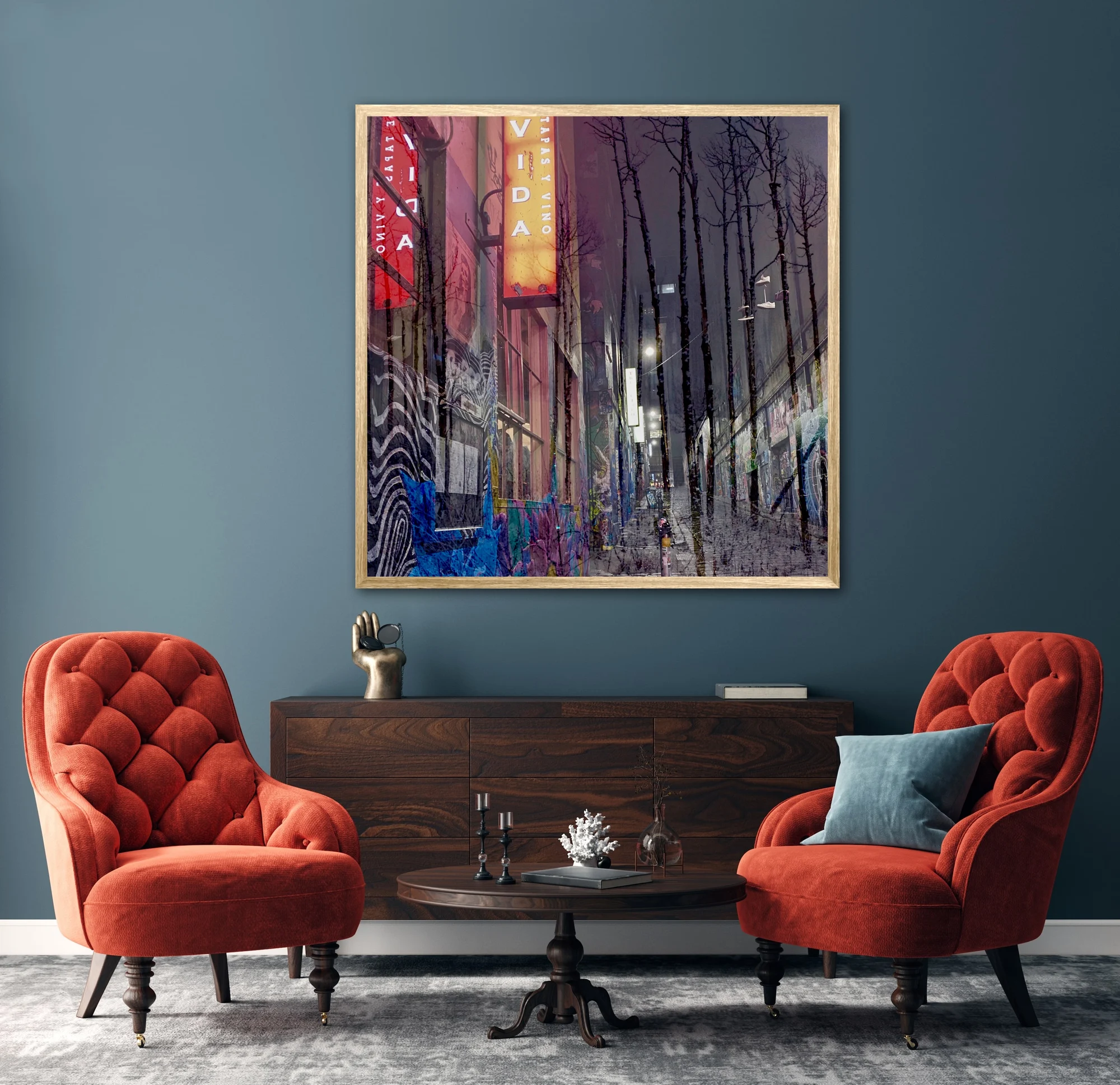 Large canvas print 100x80cm of an original photograph collage of Hosier Lane, Melbourne and Aspen pines Colorado. Boxed framed in raw oak.