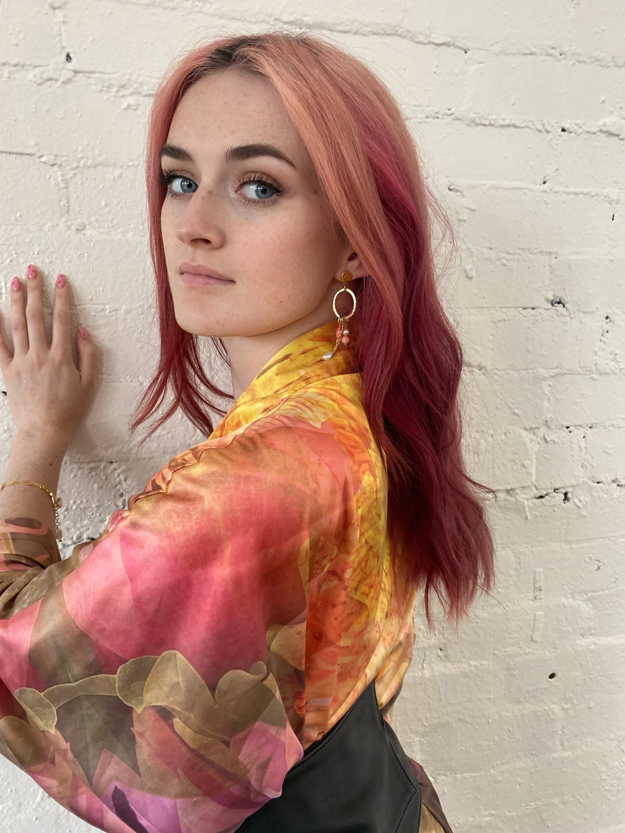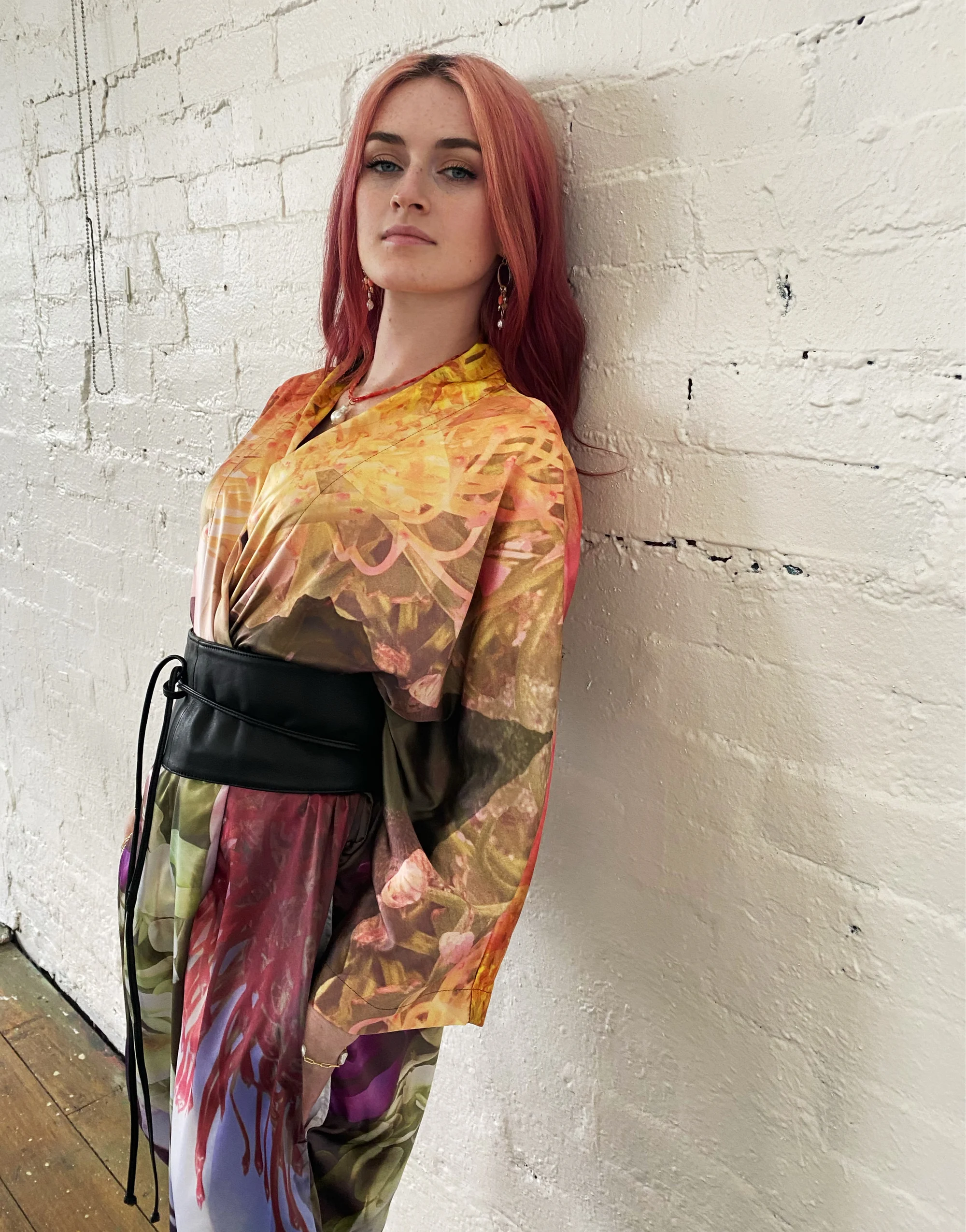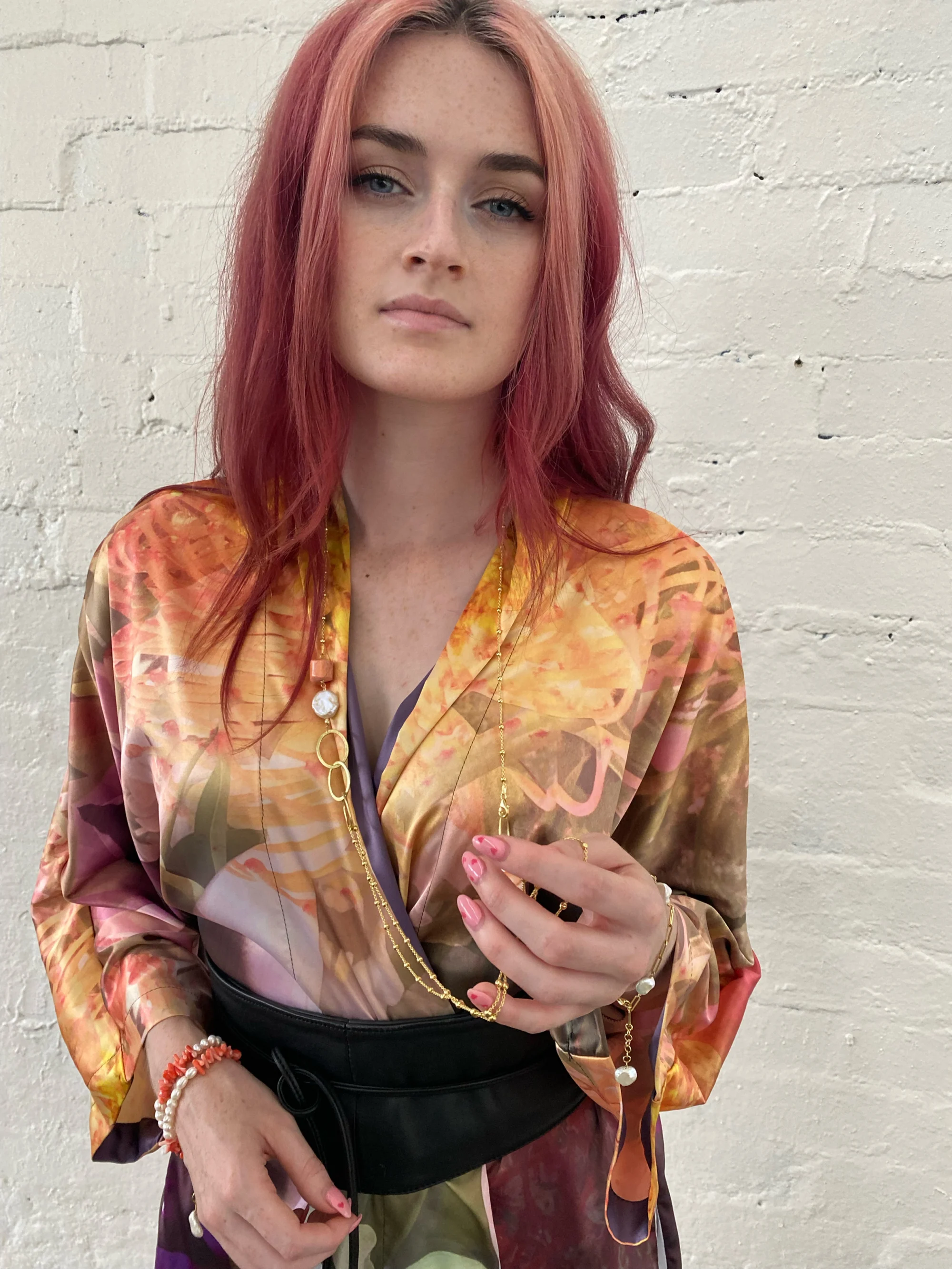 Handmade and printed to order, an original artwork transposed to a kimono, choose to wear it as a stylish layer when out and about, instead of a cardigan. The custom silk sensation robe makes an elegant layer for evening wear.Lovingly handmade with Silk Sensation polyester.Cut in a modern kimono style that still references their Japanese heritage. This short-style robe should fit loosely with three-quarter length sleeves and a hemline that only reaches the mid-thigh/just above knee. The traditional wide, full-length Kimono collar can be worn either turned-down to display the contrast interior, or turned-up around the neck.